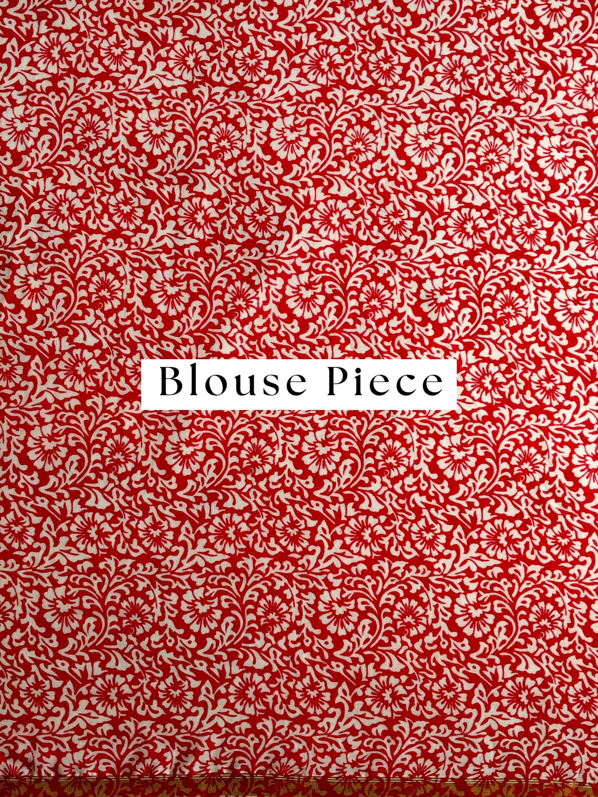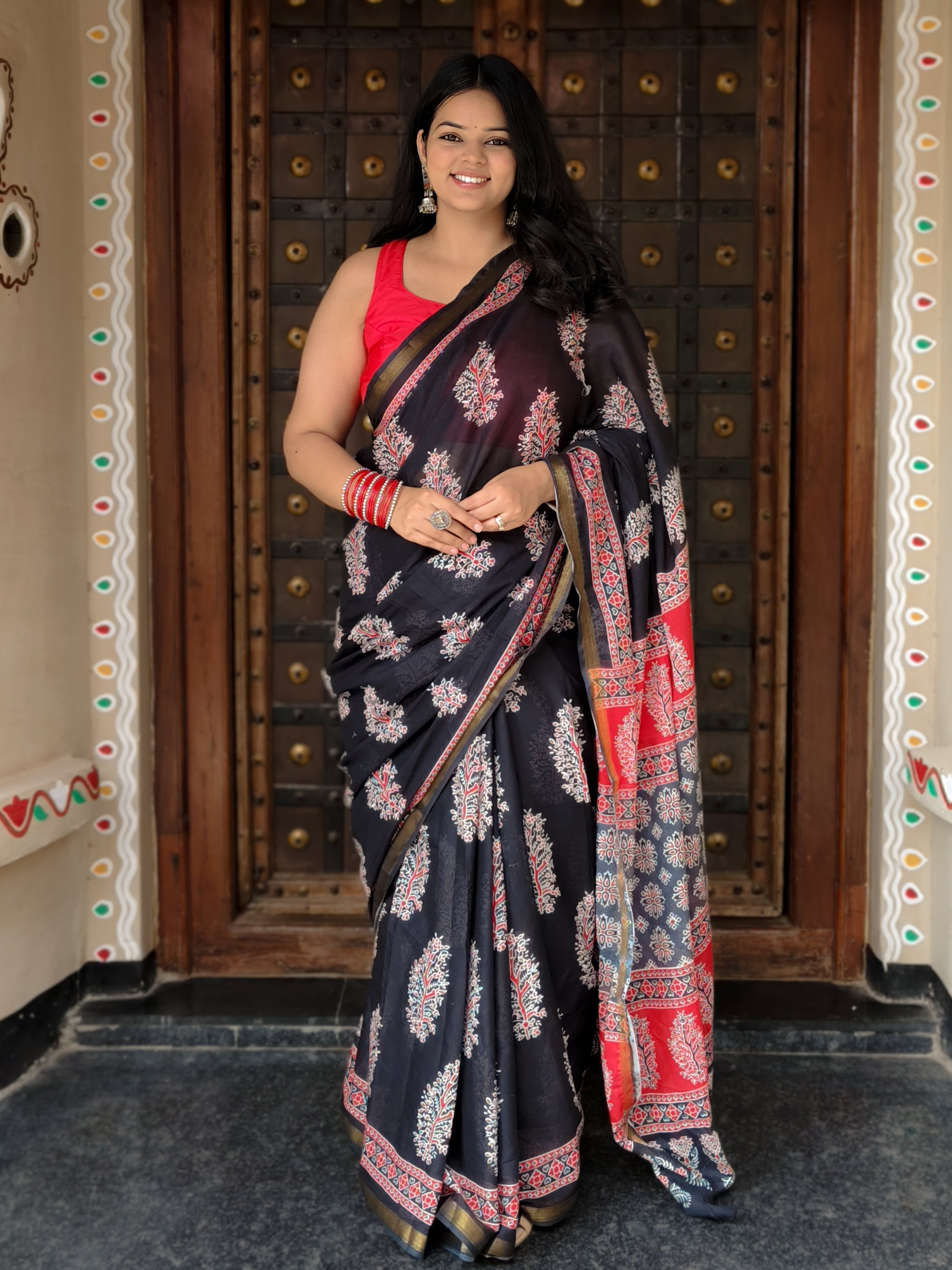 Crafted in soft black Chanderi cotton, this saree features delicate handblock prints, a vibrant red and grey pallu, and a golden zari touch, made for festive moods and graceful evenings.