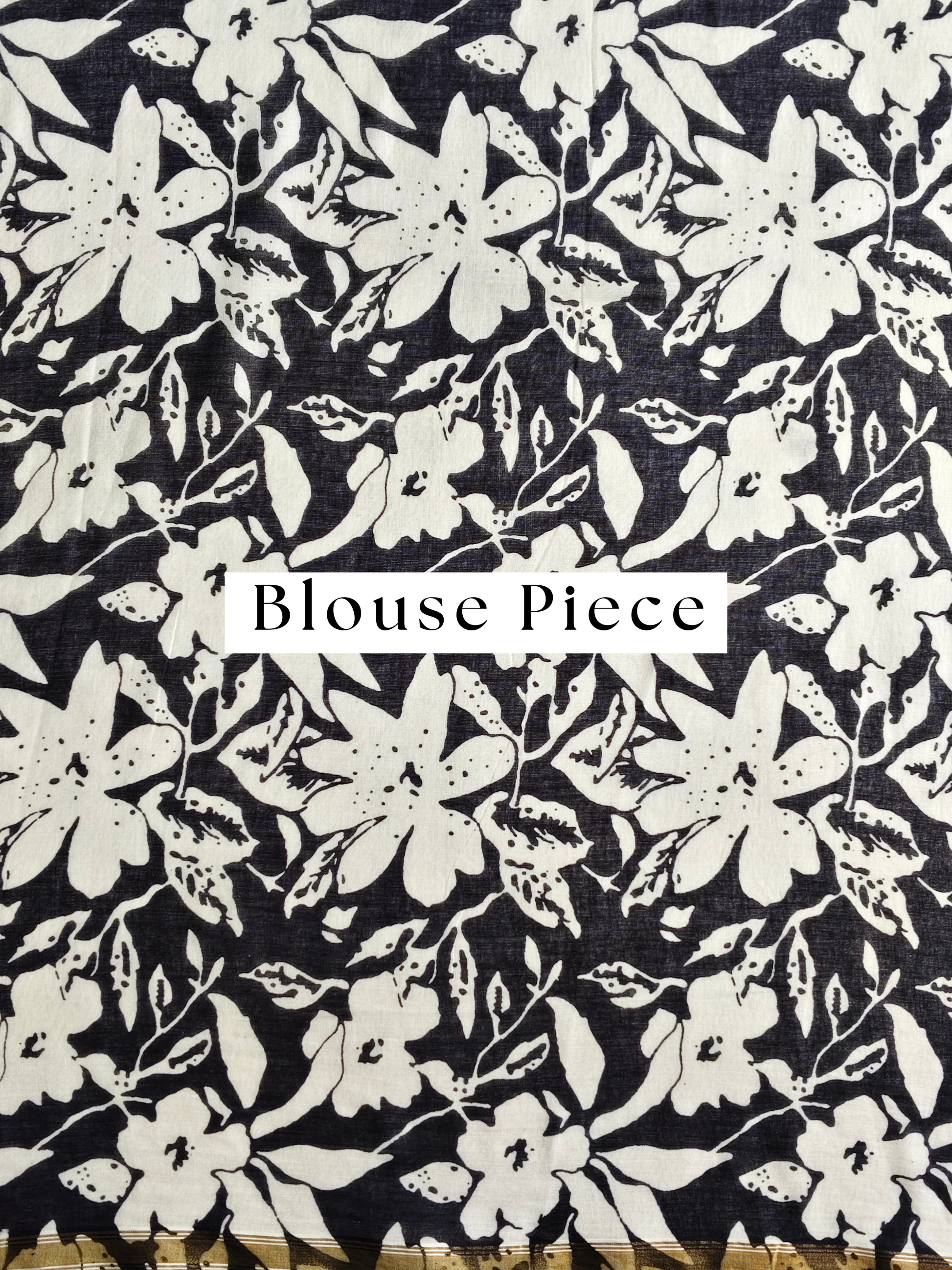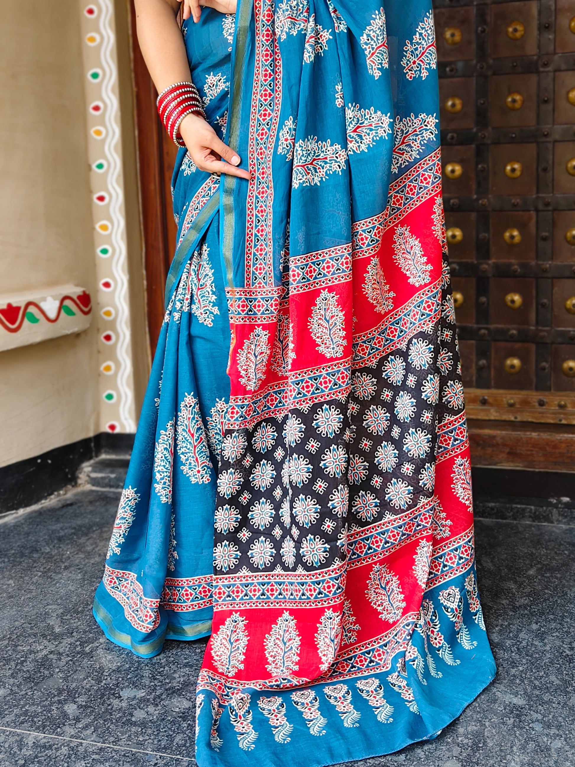 This lightweight blue Chanderi cotton saree is adorned with classic floral and paisley handblock prints, a bold red-black pallu, and a soft zari border, perfect for easy elegance.
