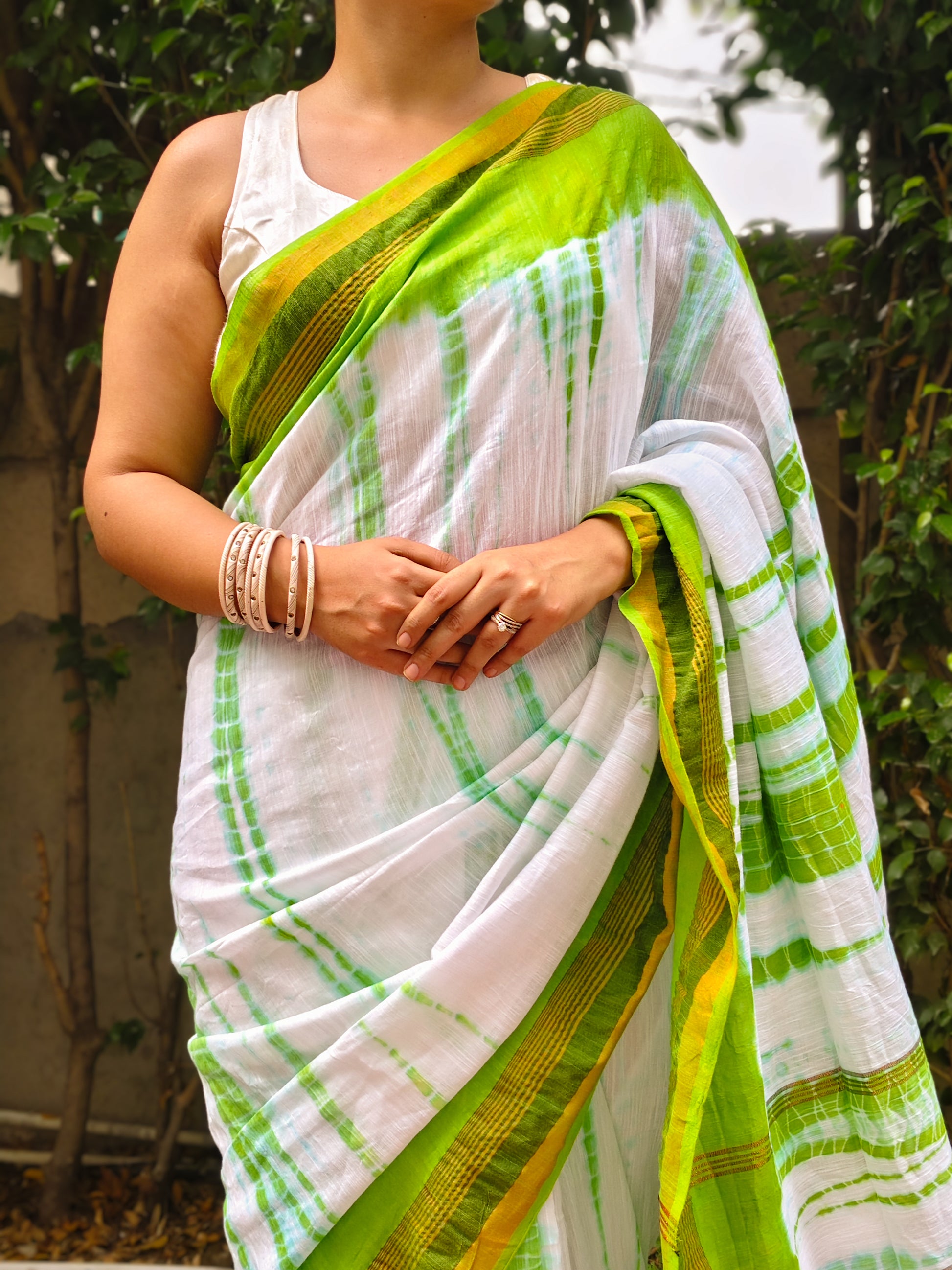 In soothing green with soft white tie-dye, this pure cotton saree is finished with a subtle copper zari border — a perfect blend of nature and tradition.