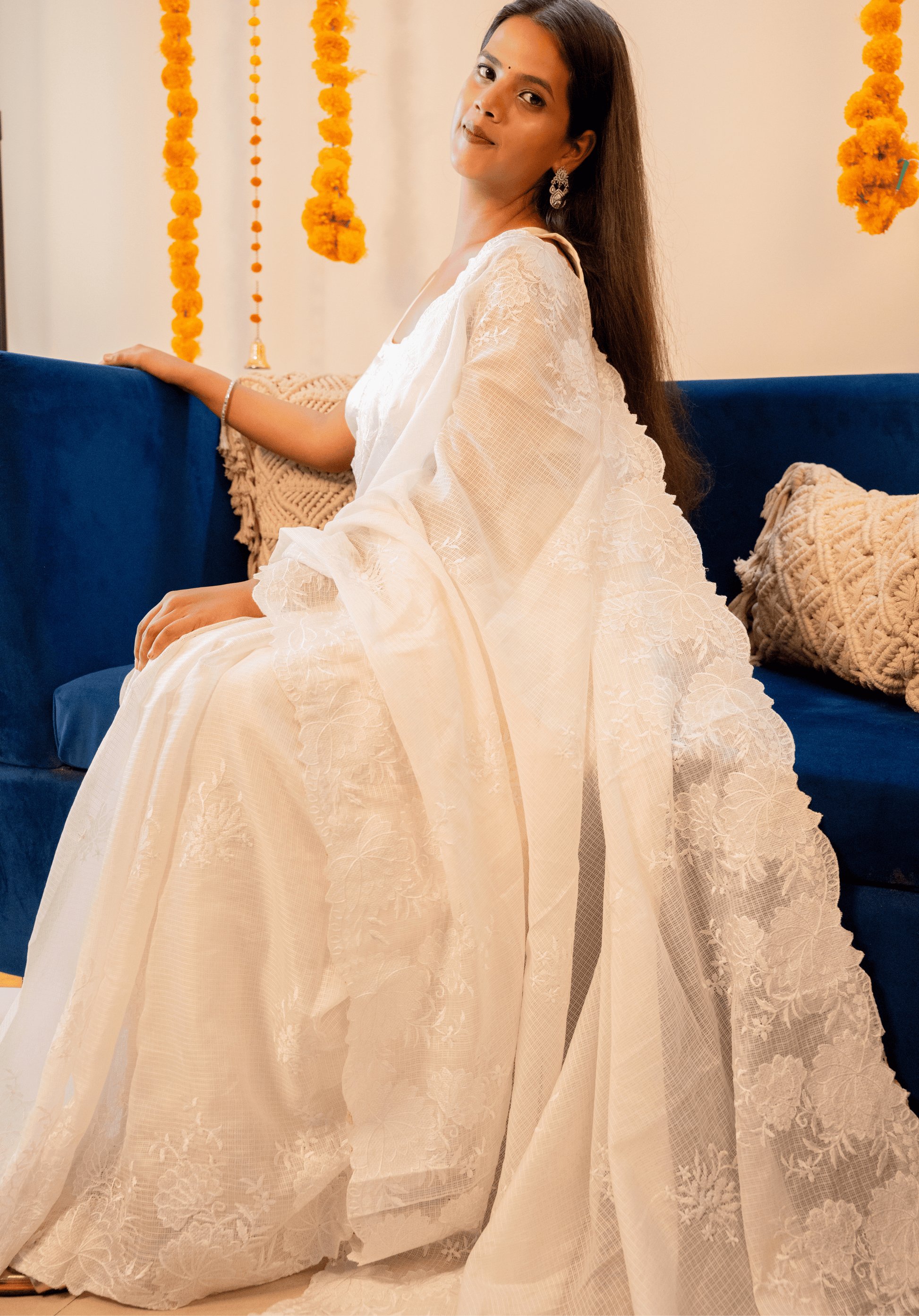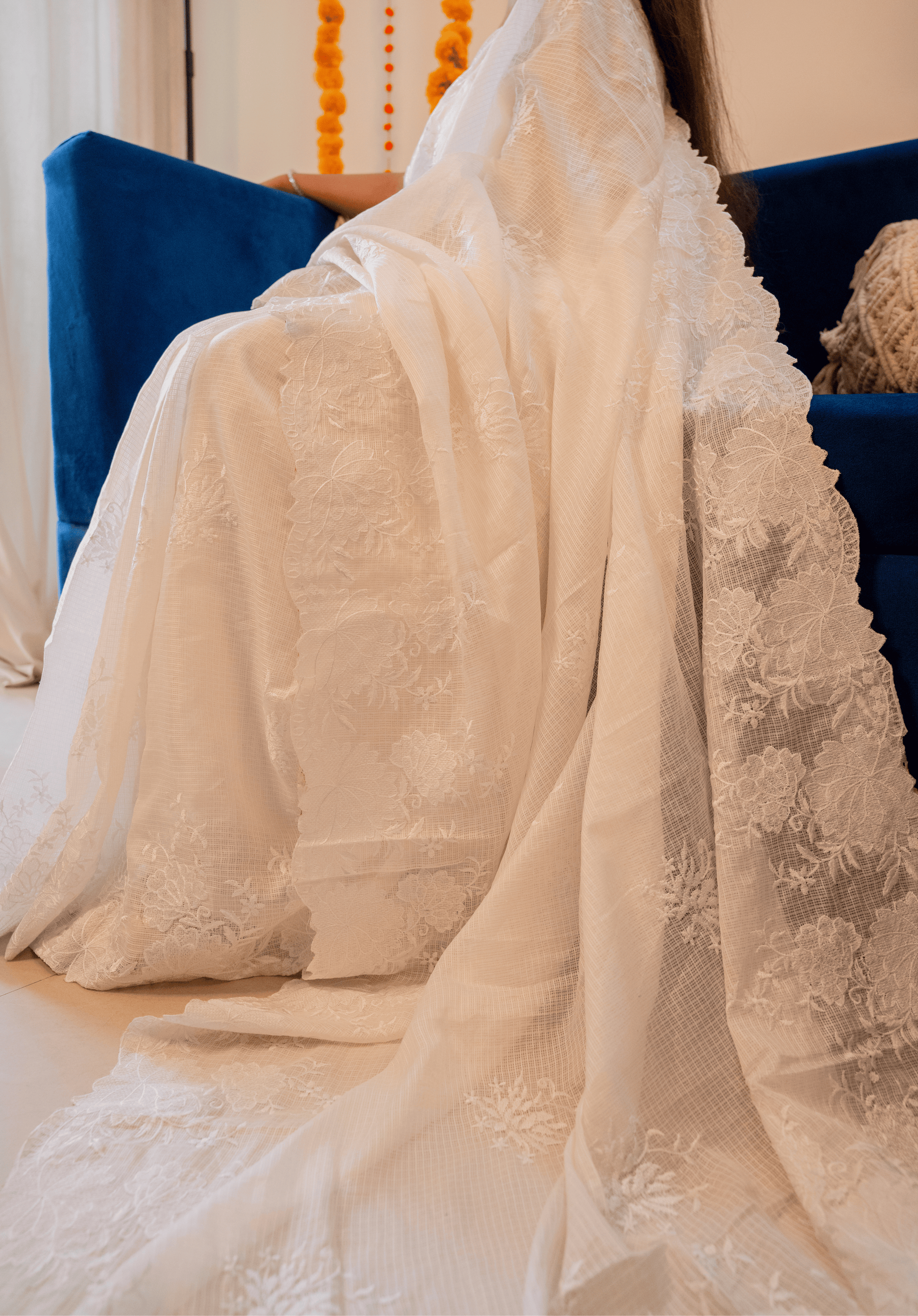 Ivory elegance redefined, the feather-light kota doria fabric with delicate cutwork, made for timeless sophistication.