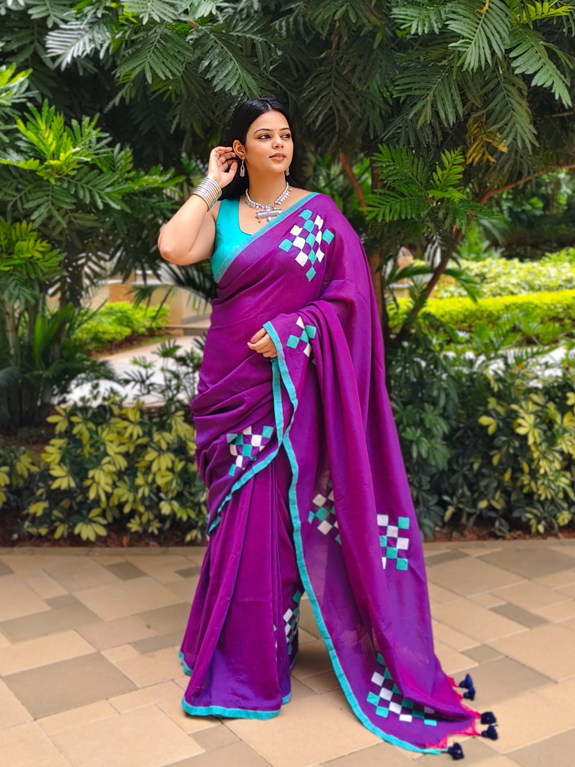 Handwoven in a rich purple hue, this saree is uplifted with a fresh teal border and delicate teal & white patchwork.