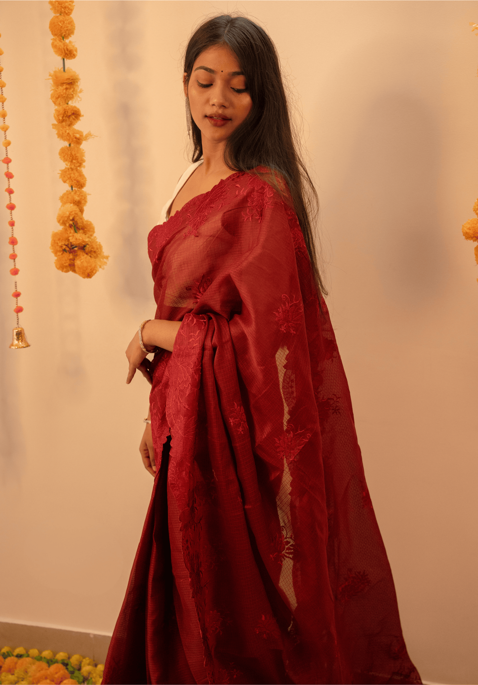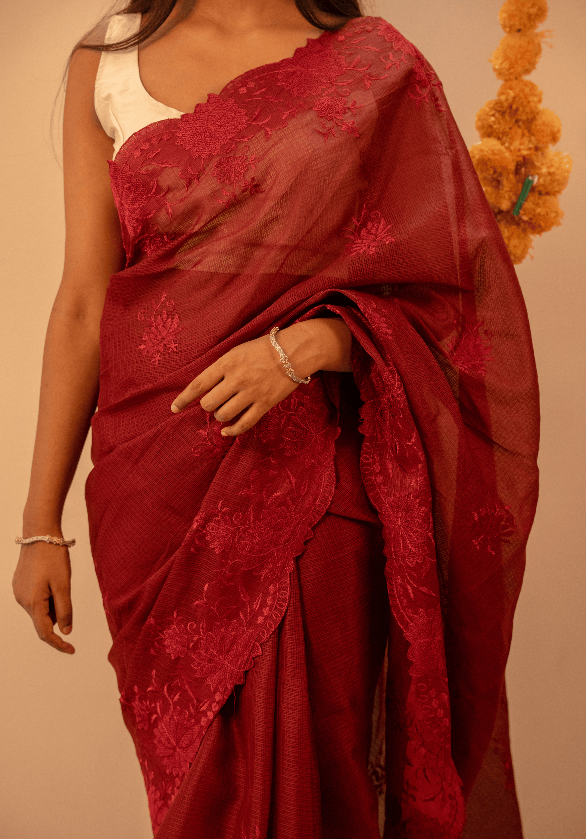 Drape elegance with our maroon cutwork kota doria saree. It's feather-light, soft, and effortlessly stylish. Perfect for festive evenings or family get-togethers