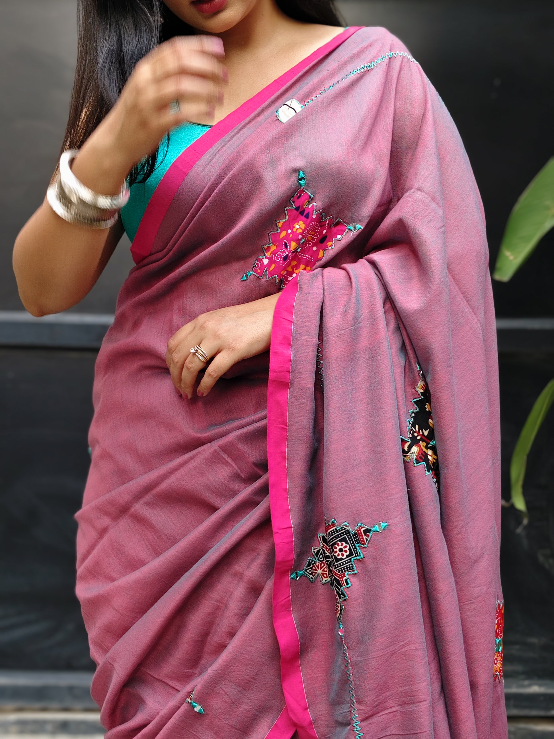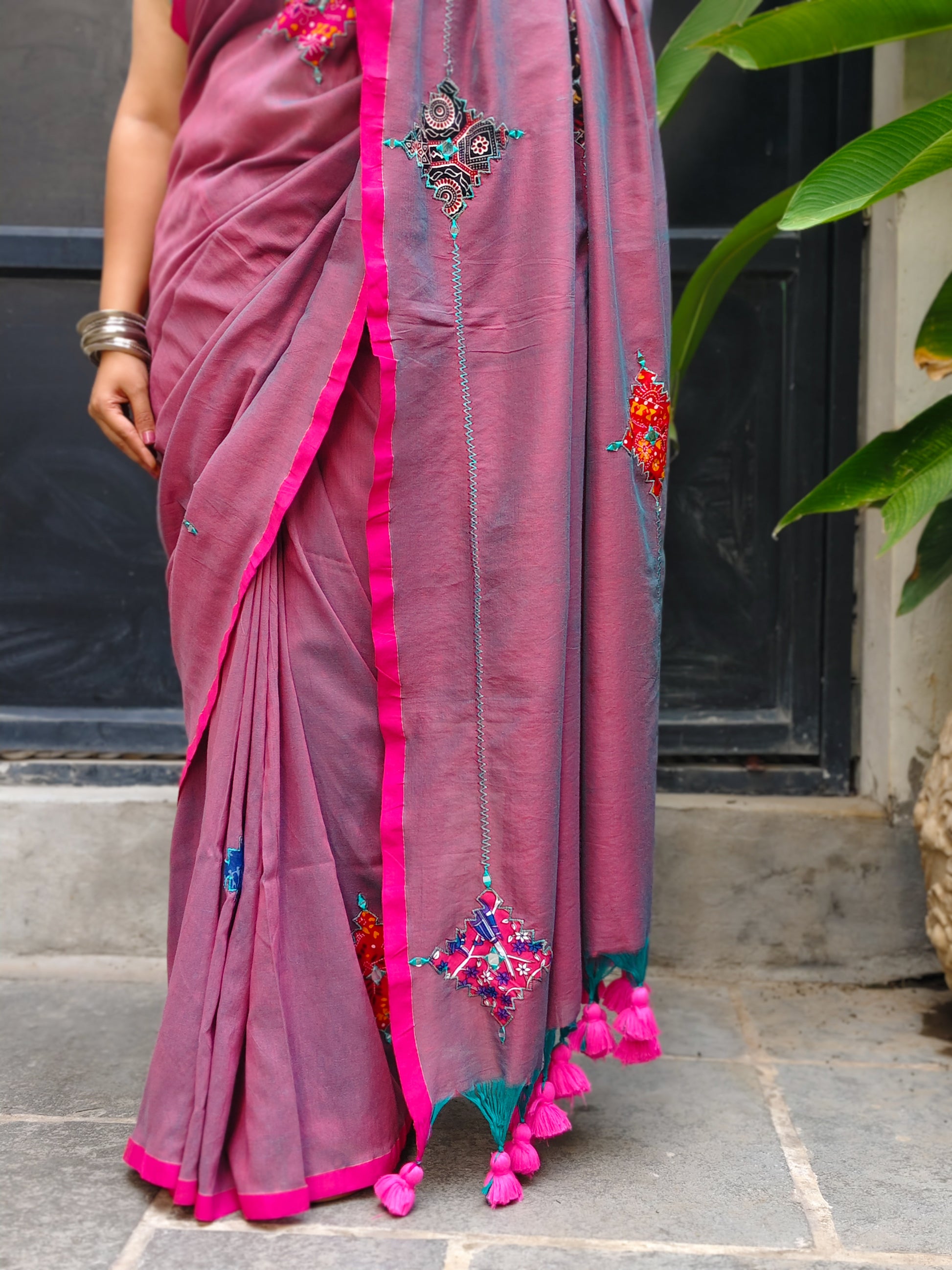 In a dreamy mauve dual tone, this handwoven cotton saree pairs gentle hues with a bright pink border and printed patchwork