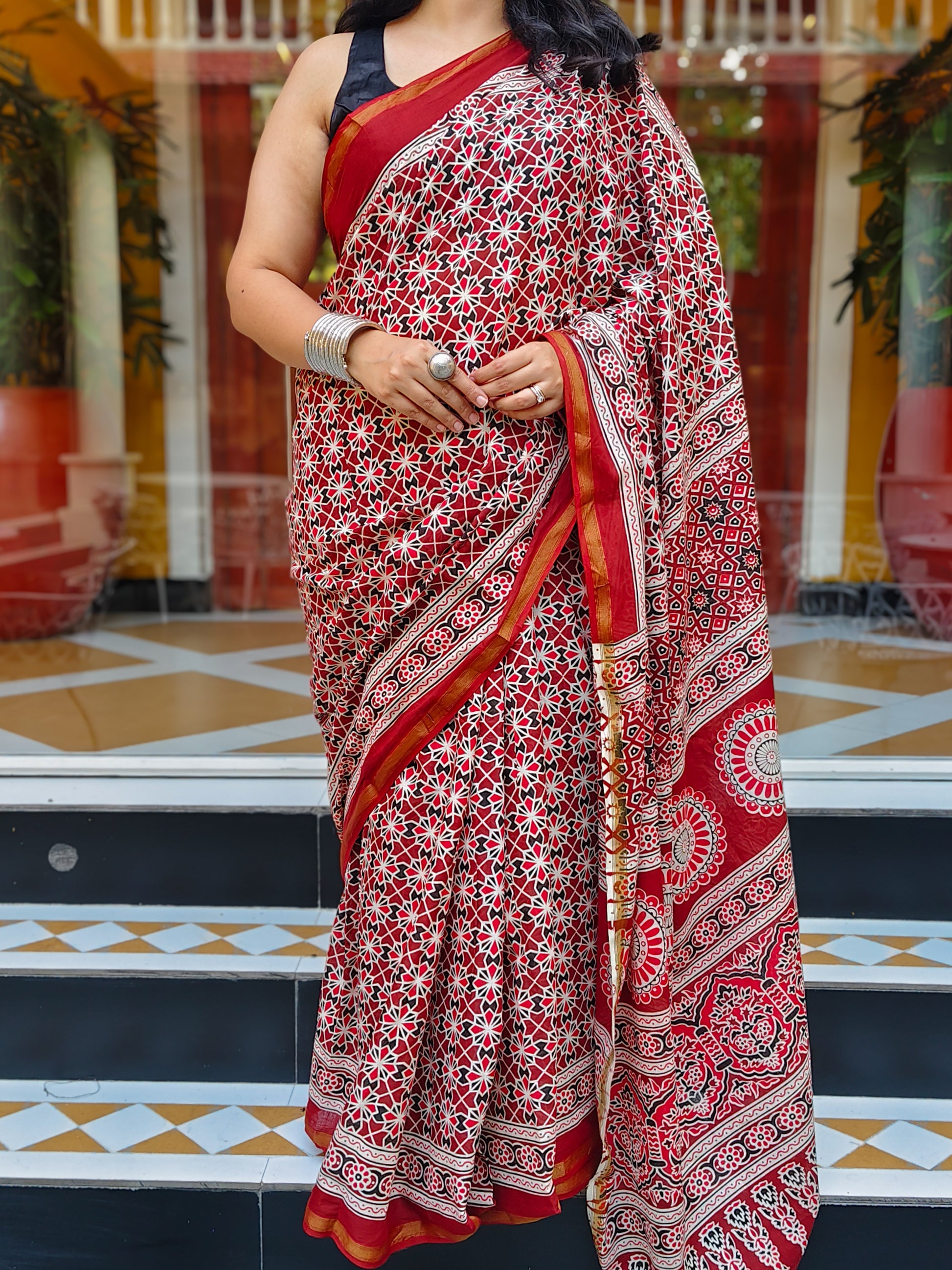 In rust and soft white, this chanderi cotton saree features delicate floral patterns and a rich Ajrakh-style pallu, a beautiful blend of tradition and everyday ease.