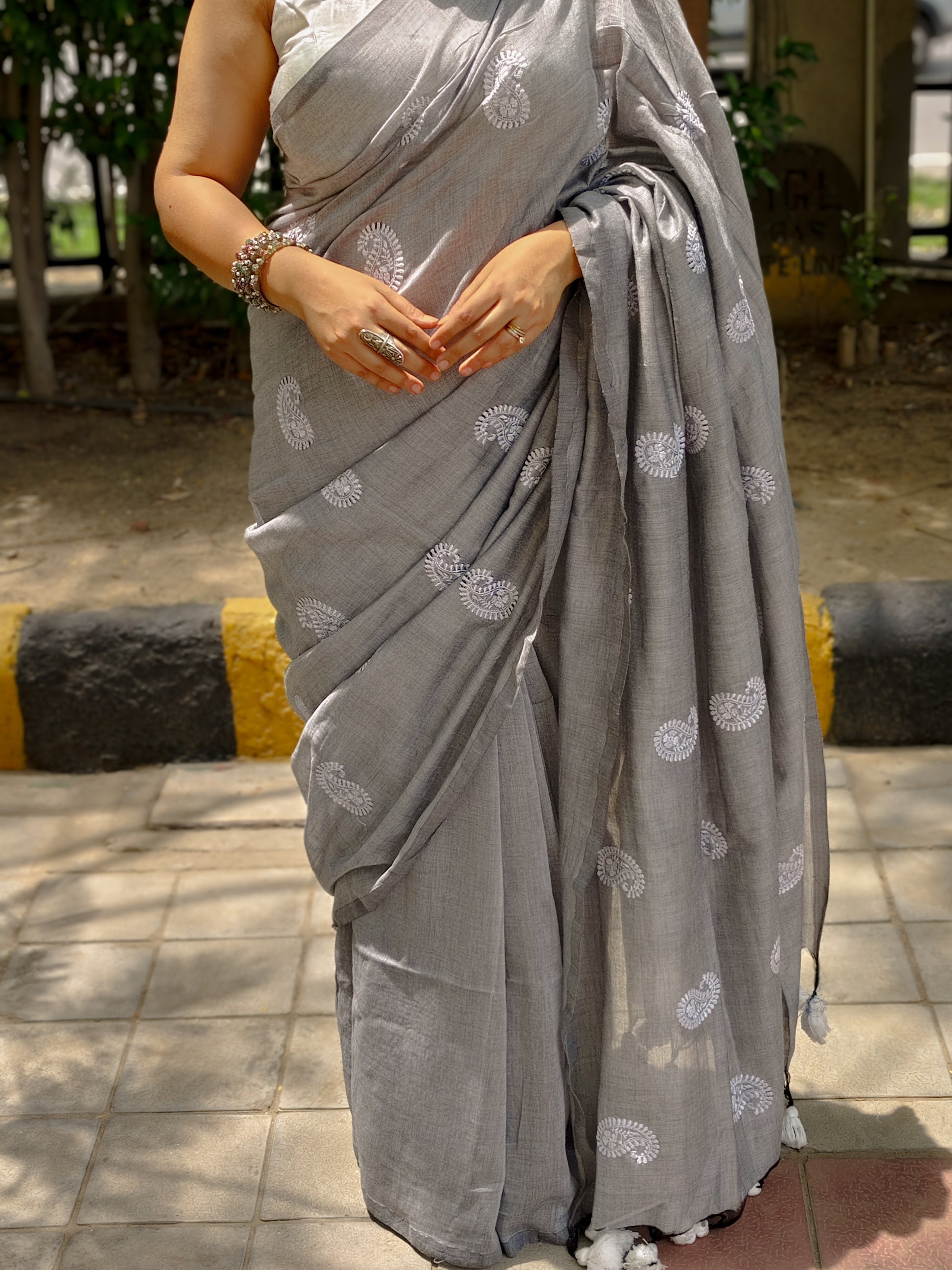 This soft slate grey saree features white ambi embroidery and a matching grey border — understated, versatile, and quietly powerful.