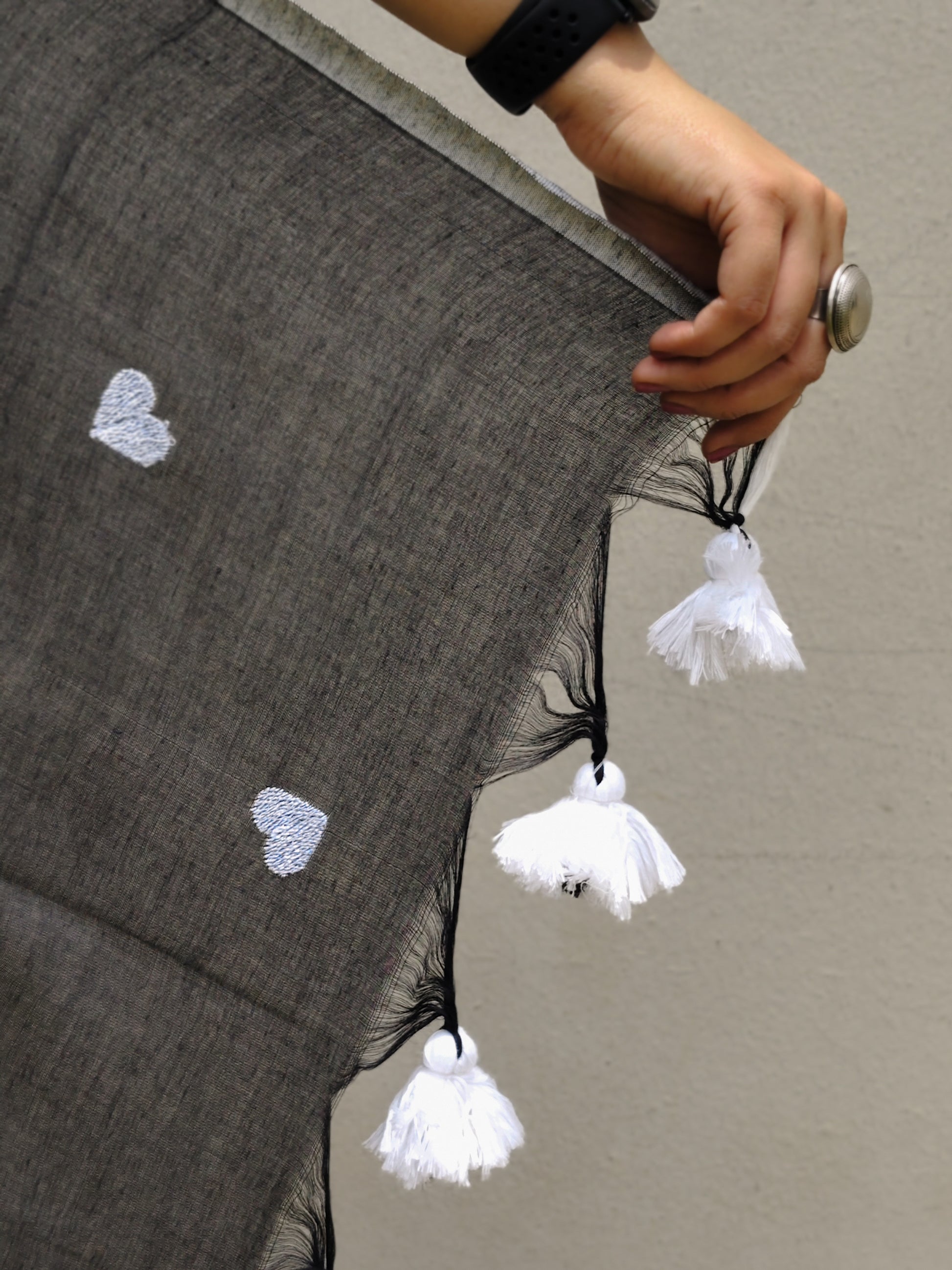 Classic never felt this heartfelt. Handwoven in black cotton with white heart embroidery and a white border, this saree is bold, breathable, and effortlessly elegant.