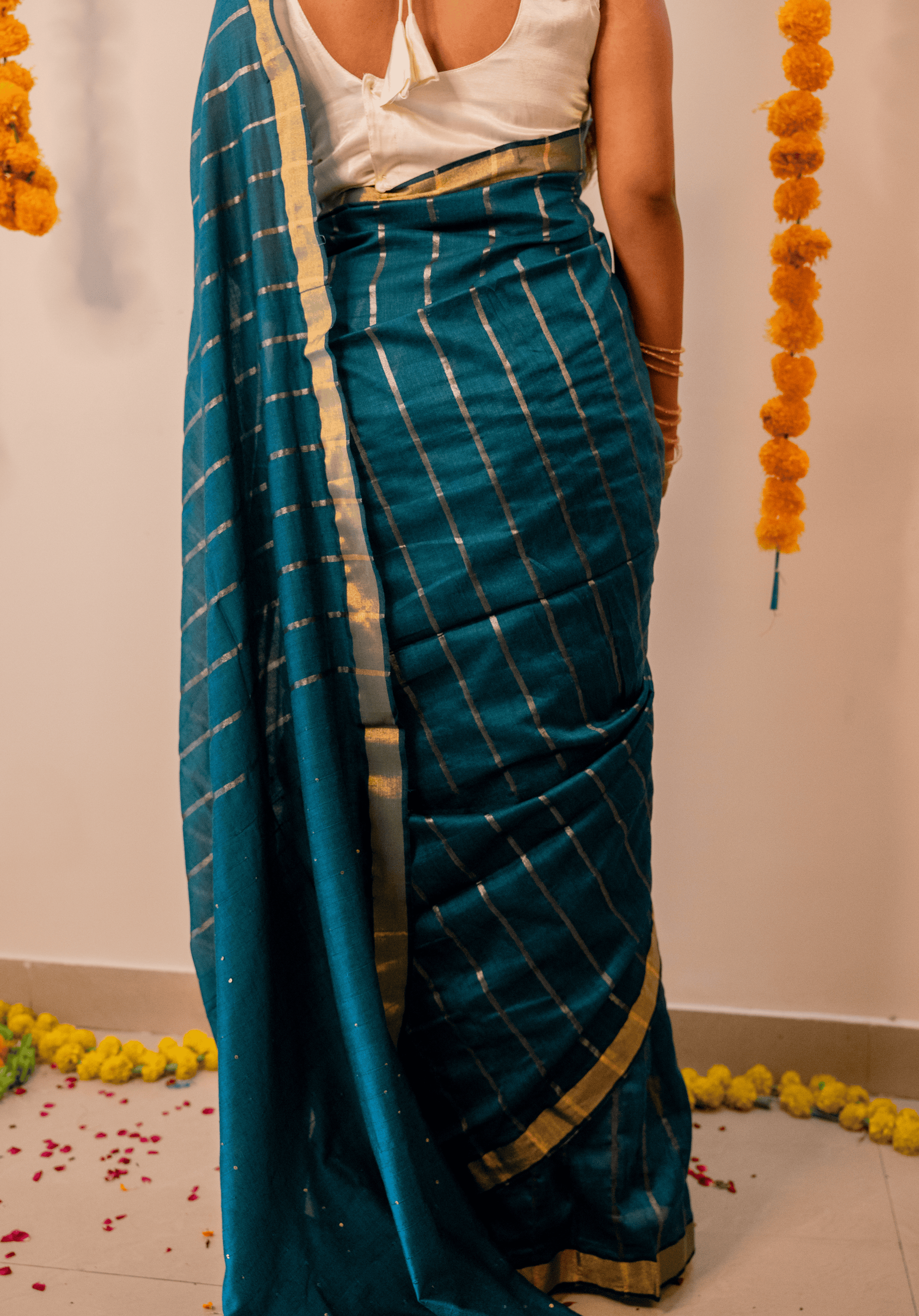 Soft cotton saree in teal green with all-over zari stripes, a zari border, and a sequinned pallu. Simple, charming and timeless.