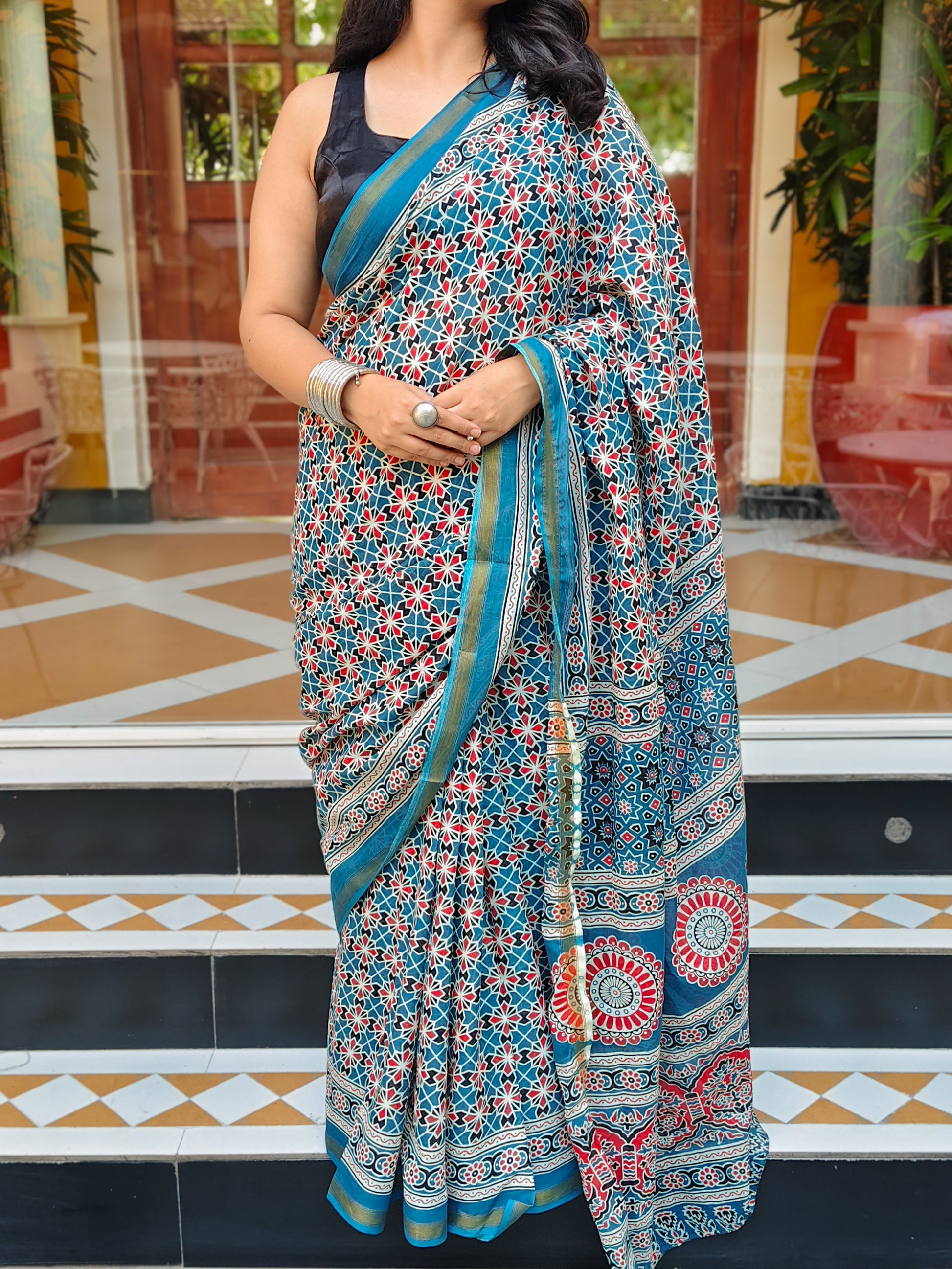 A riot of print, wrapped in calm.This lightweight chanderi cotton saree in teal and white is adorned with intricate all-over floral motifs and a stunning Ajrakh-inspired pallu and border, perfect for everyday grace with a statement edge.