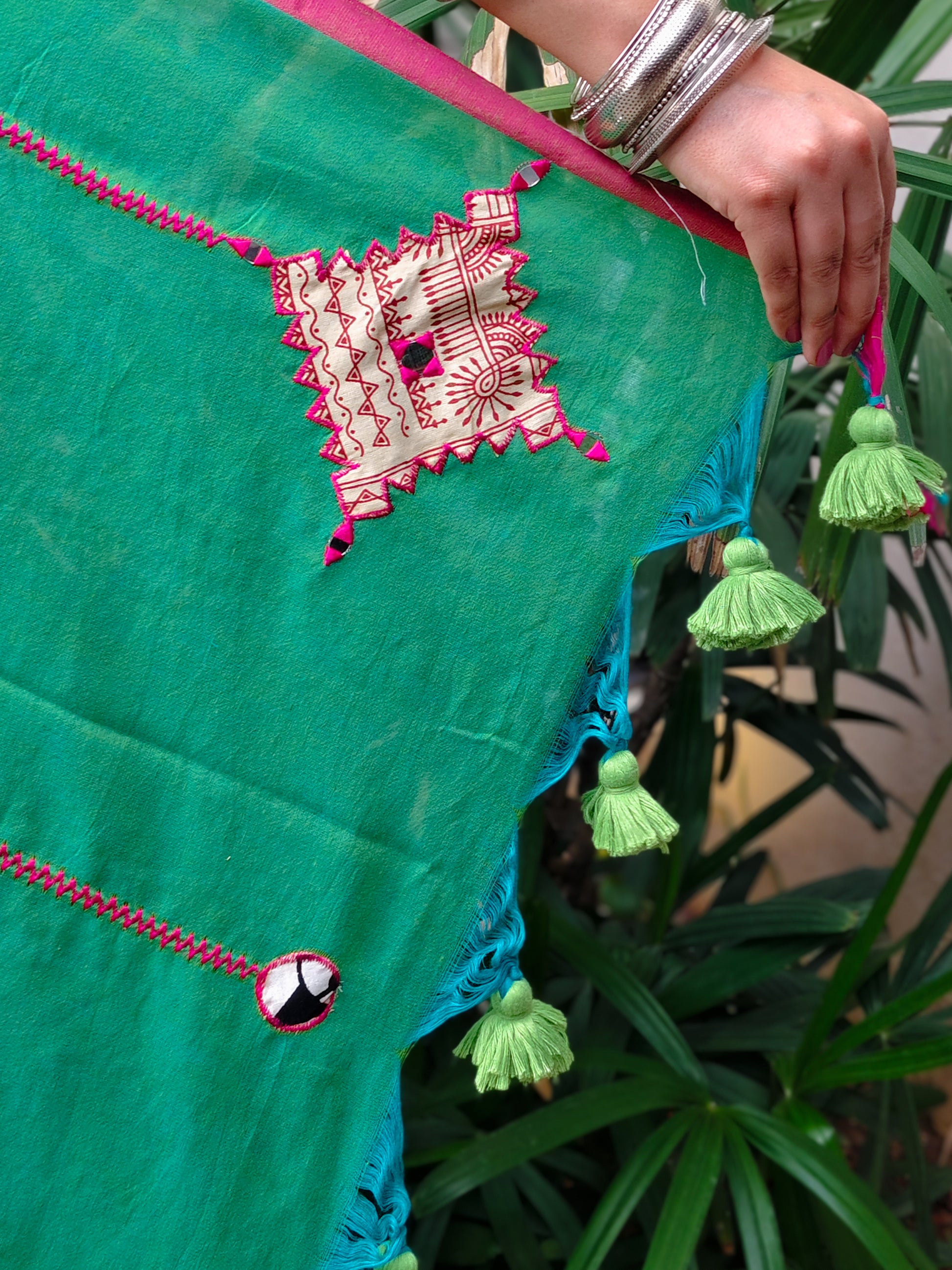 This dual-tone green soft cotton saree is handwoven for ease and grace, with a pop of pink at the border and printed patchwork that adds a playful touch.