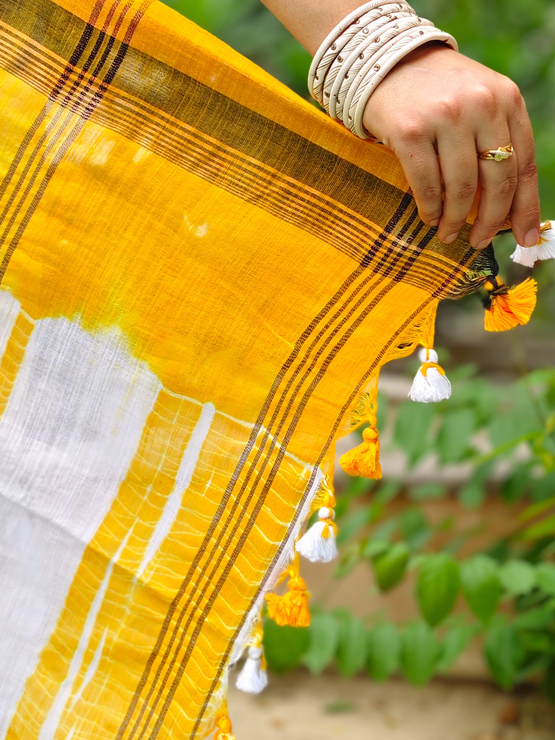 This pure cotton saree in cheerful yellow and white tie-dye is light, airy, and finished with a delicate copper zari border — perfect for slow mornings, festive afternoons, or chai in the verandah.